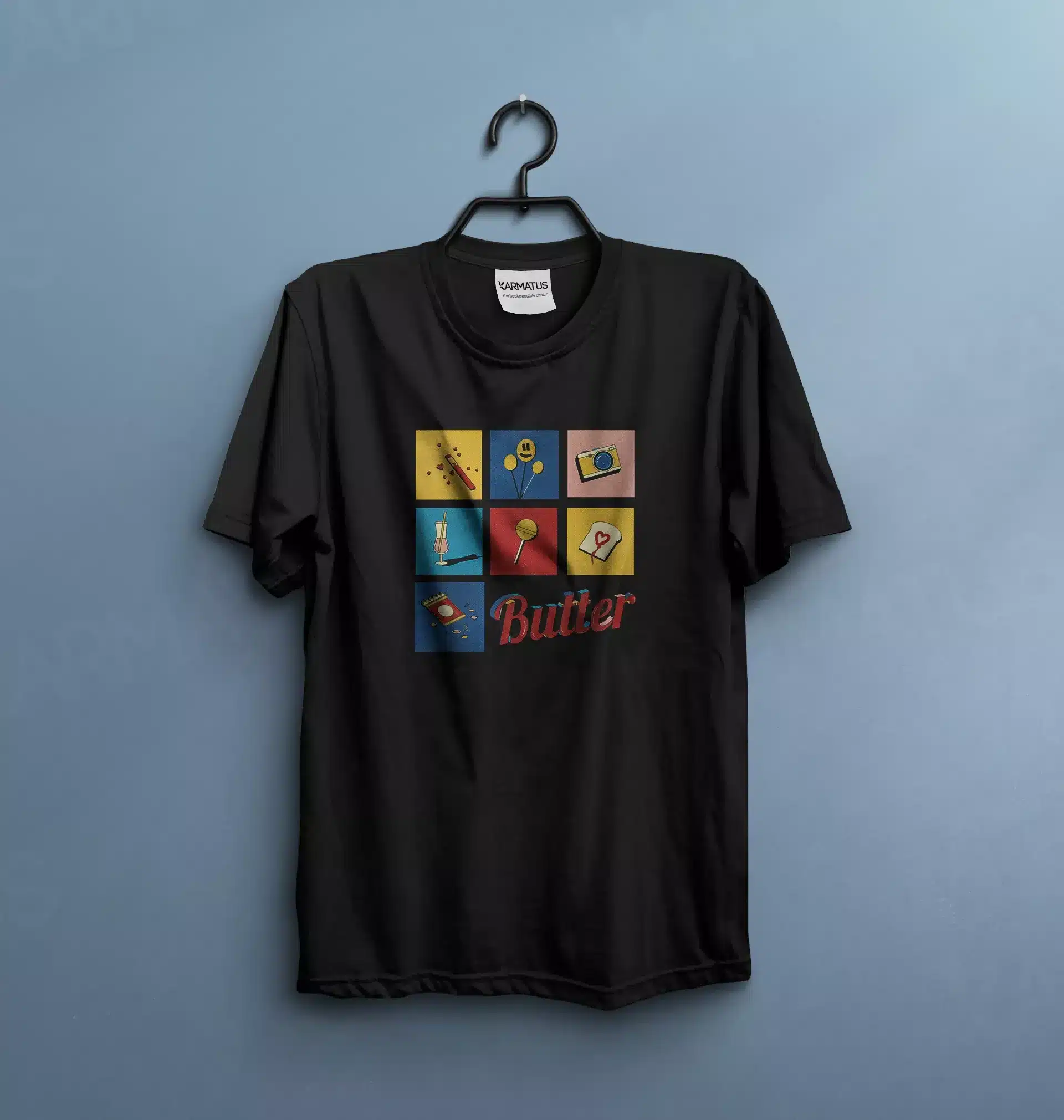 • در کارماتوس، کنتراست رنگ‌ها مهم است؛ طرح شما متناسب با رنگ تیشرت ادیت می‌شود تا بهترین نمایش را داشته باشد.