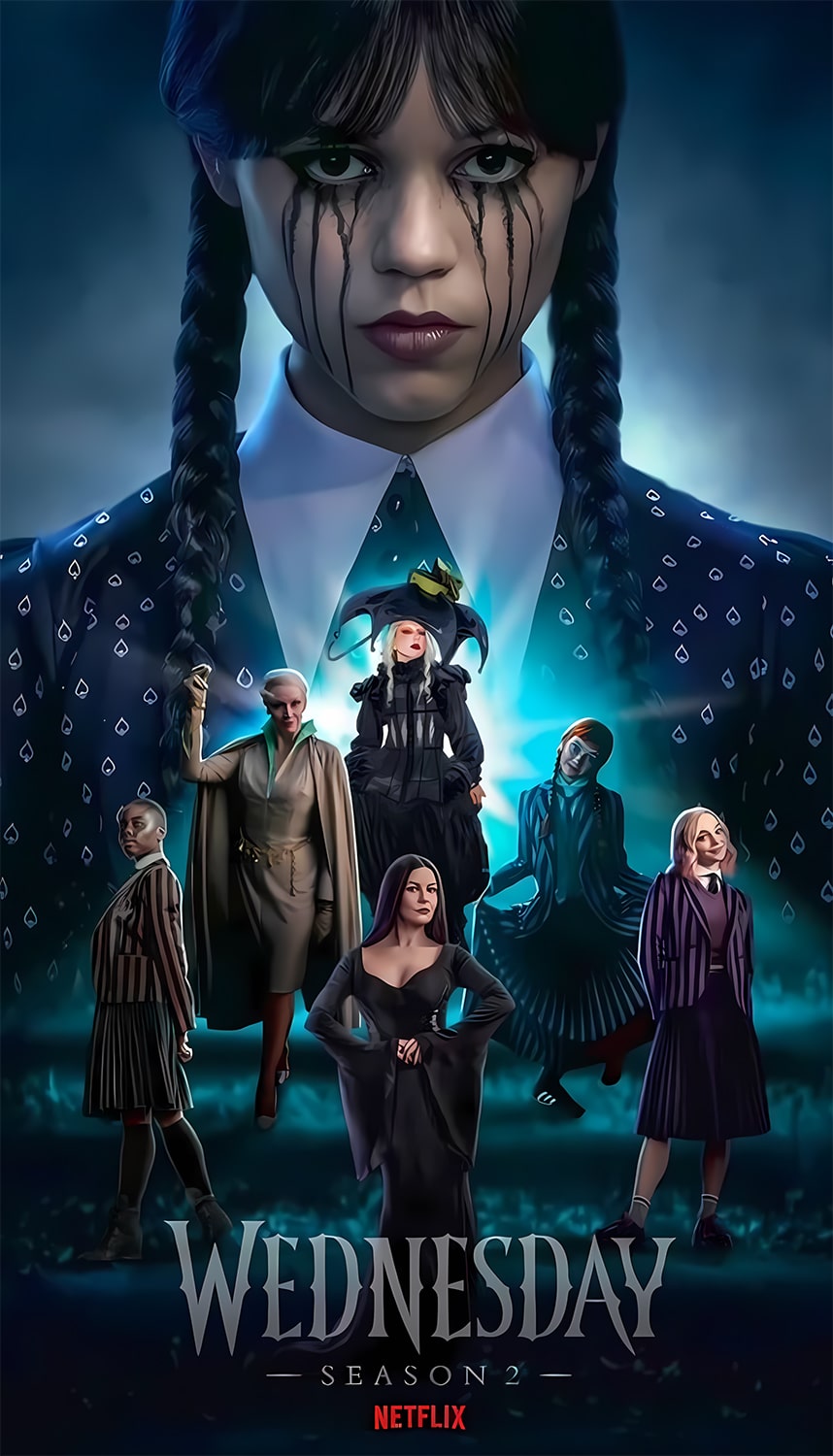 فصل دوم سریال Wednesday قراره خیلی تاریک‌تر، پیچیده‌تر و هیجان‌انگیزتر باشه! این سریال محبوب نتفلیکس با فضای گوتیک Nevermore Academy، رازهای پنهان و شخصیت‌های عجیب‌وغریب، دنیای خاص خودش رو ساخته. والپیپرهای فصل 2 پر از تصاویر جدید، صحنه‌های اکشن و لحظات دارک‌کمدی هستن.